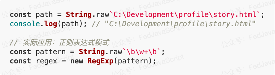 处理包含反斜杠的字符串时,String.raw可以避免转义字符的问题,特别适合处理文件路径、正则表达式等场景。