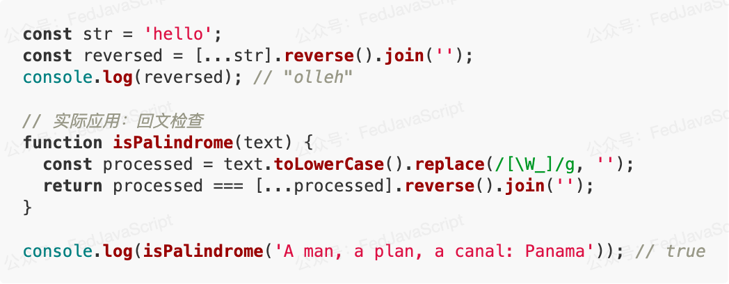 使用扩展运算符配合数组方法可以优雅地实现字符串反转,这种方法还能正确处理Unicode字符。