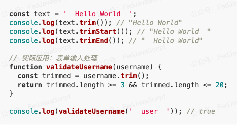 trim、trimStart和trimEnd方法提供了完整的空白字符处理解决方案,特别适合处理用户输入。