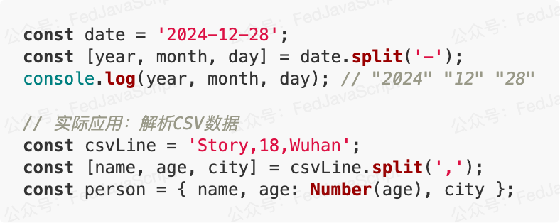 结合split和解构赋值,可以轻松实现字符串的分割和数据提取。