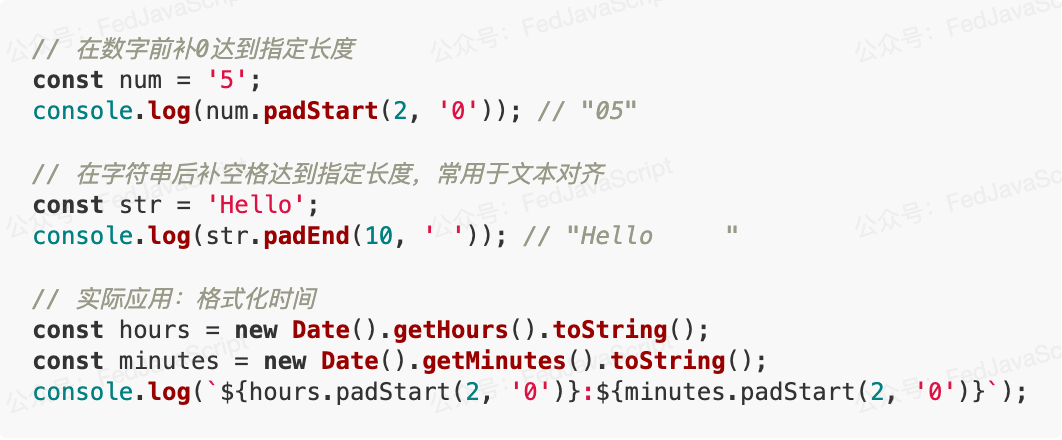 在处理数字格式化、对齐文本等场景中,padStart和padEnd是非常实用的方法。它们可以在字符串的开头或结尾添加指定的字符,直到达到期望的长度。