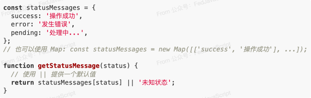 当 if-else 的分支增多,且每个分支都对应一个固定的返回值时,使用 Map 或对象来进行查找(lookup)是绝佳的选择。