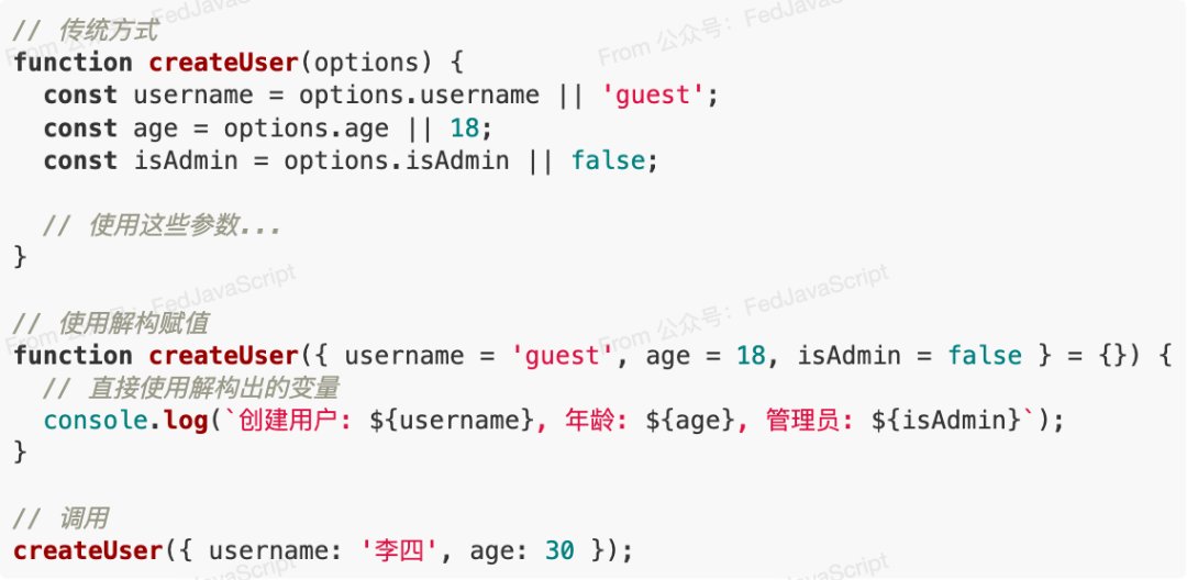 解构赋值在处理函数参数时特别有用,尤其是当函数需要接收多个选项参数时: