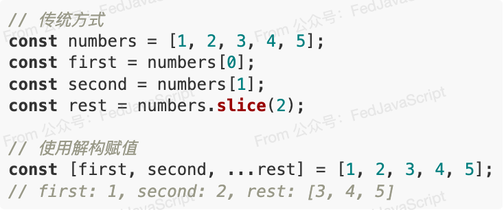 解构赋值可以轻松处理数组,并使用剩余参数(rest)语法捕获剩余元素:
