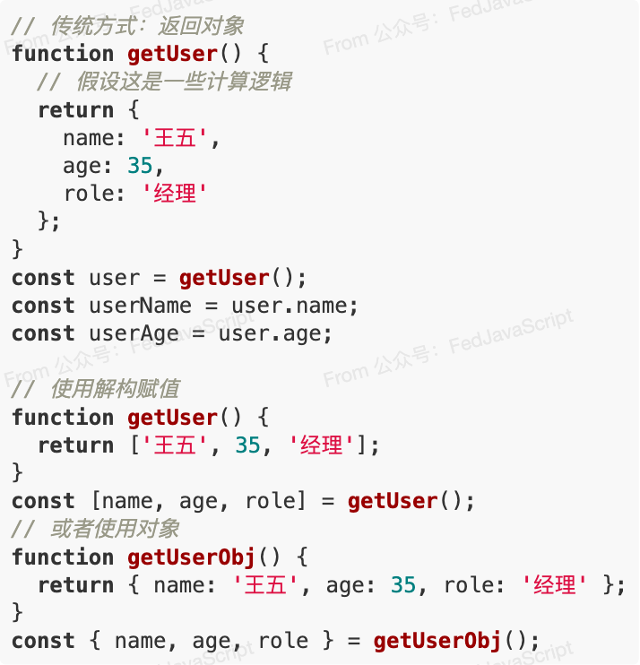 JavaScript函数传统上只能返回单个值。使用解构赋值,我们可以更优雅地处理多返回值: