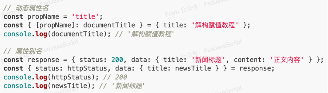 解构赋值支持动态属性名和为变量指定别名,这在处理API数据或整合不同数据源时非常有用: