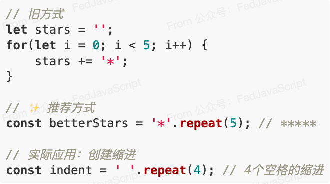 需要重复同一个字符串多次时,使用repeat()方法比循环更简洁: