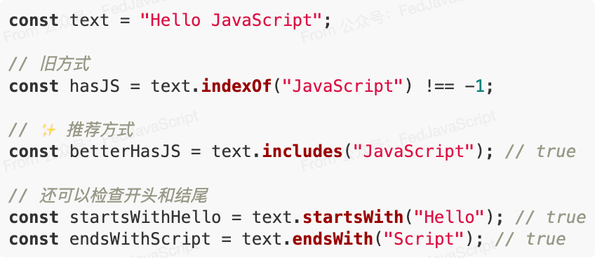 在检查字符串是否包含特定内容时,includes()比indexOf()更直观: