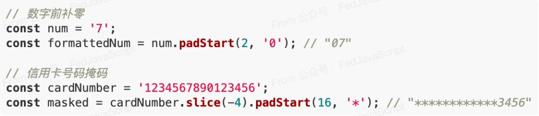 在处理数字格式化、创建固定长度的字符串时,padStart()和padEnd()特别有用: