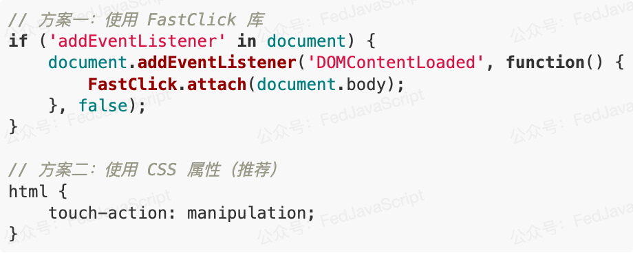 移动端浏览器存在 300ms 的点击延迟,这是为了区分双击和单击。我们可以通过以下方式消除这个延迟: