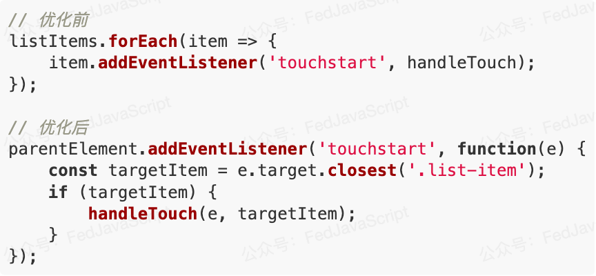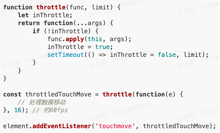 对于频繁触发的触摸事件,使用节流可以显著减少事件处理次数,提升性能: