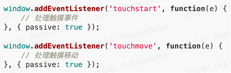 事件的处理完成,才能执行滚动,这会导致明显的延迟。通过添加 passive 标志,我们可以告诉浏览器无需等待事件处理即可执行滚动: