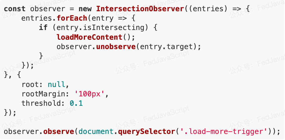 在滚动加载场景中,使用 IntersectionObserver 可以提供更好的性能: