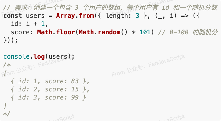一行代码,一个结构清晰、内容随机的对象数组就诞生了。是不是比写三遍 for 循环 push 一个对象要爽得多?