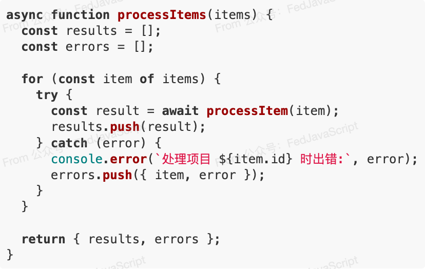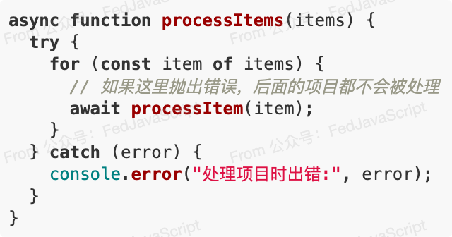 一个项目的错误会中断整个处理流程,这可能不是你想要的行为。