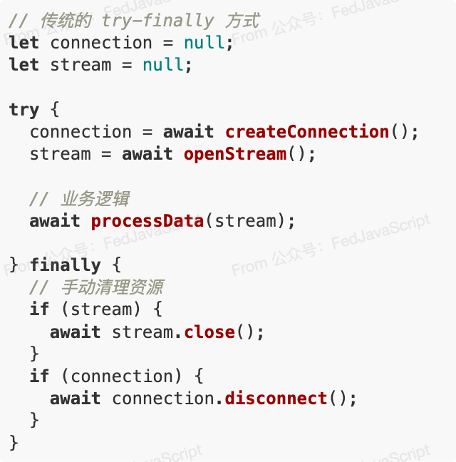 在JavaScript开发中,资源管理一直是个让人头疼的问题。传统的 try-finally 模式虽然能保证资源释放,但代码冗长且容易出错。