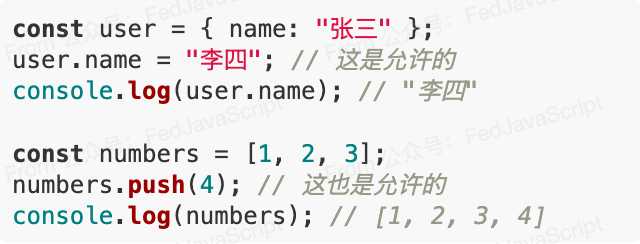 许多开发者误以为 const 声明的对象或数组是完全不可变的: