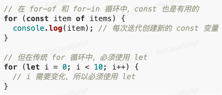 被忽略的细节 :每次循环迭代, let 声明都会创建一个新的变量实例,这在处理闭包时尤为重要。