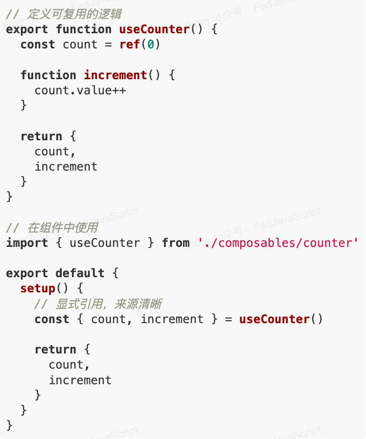 ** 显式引用 ** :每个属性和方法都通过解构清晰地引入,来源一目了然。
