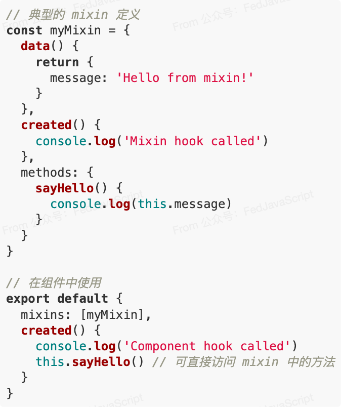 Mixins 是一种将可复用功能注入到组件中的方式。在 Vue2 中,它允许我们编写包含组件选项的对象,然后与其他组件选项混合。