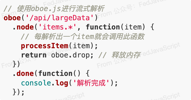 对于大型JSON数据,可以考虑使用流式解析库,如 oboe.js 或 stream-json :