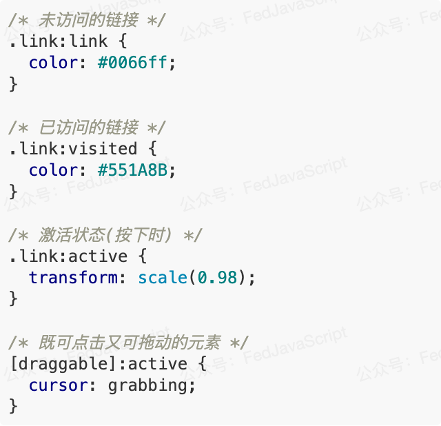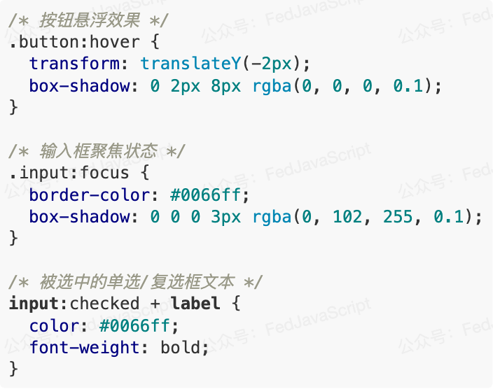 用户交互是前端的重中之重,状态伪类选择器能让交互效果更细腻: