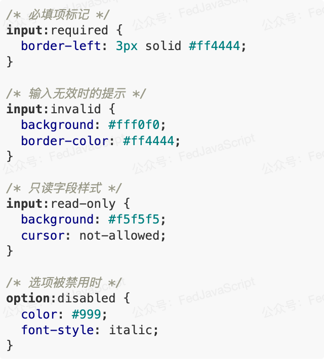 表单元素有着丰富的状态,这些选择器让我们能精确控制它们: