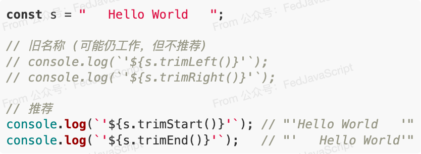 这两个方法用于移除字符串开头或结尾的空白字符。它们已被ECMAScript标准采纳,但名称更改为 trimStart() trimEnd() 以获得更好的语义一致性(与 padStart() padEnd()