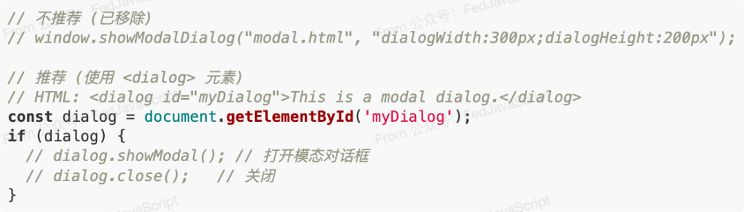 • ** HTML <dialog> 元素 ** : 一个原生的模态对话框元素,可以通过 showModal() 方法打开。