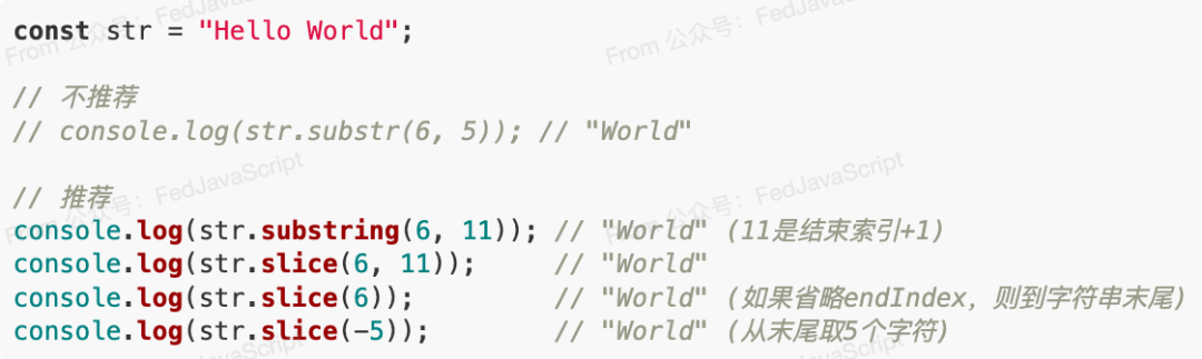 • **String.prototype.slice(beginIndex, endIndex) ** : 与 substring 类似,但可以接受负数索引(表示从字符串末尾开始计数)。