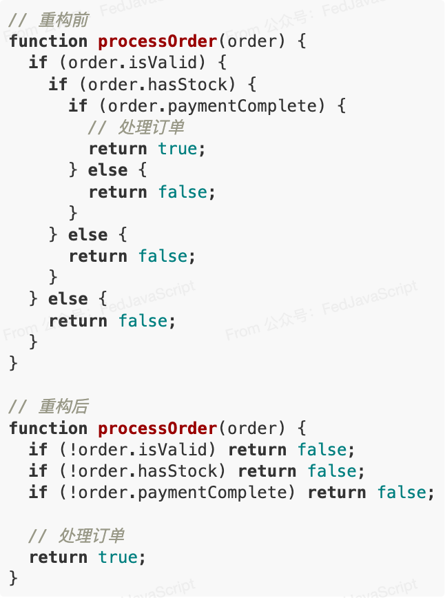 避免复杂的嵌套条件语句,使用早期返回可以使代码更清晰。