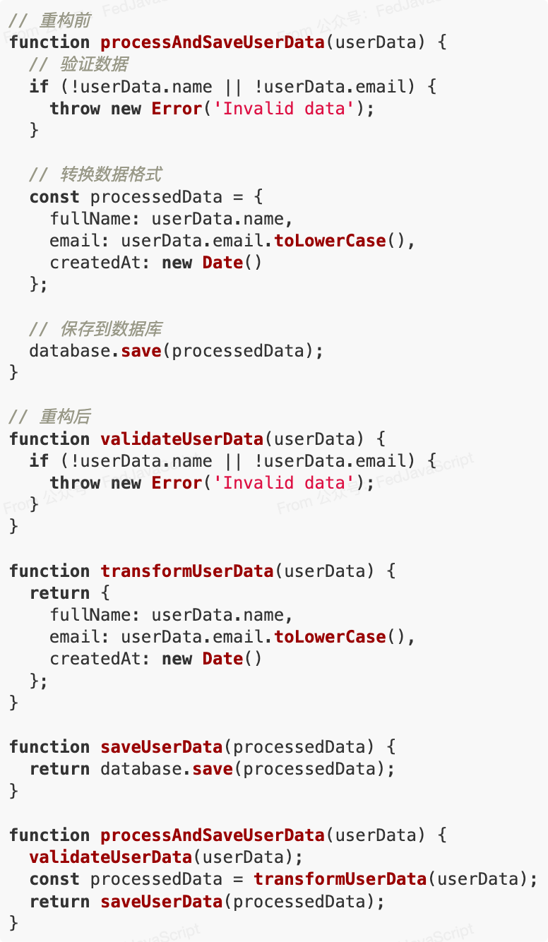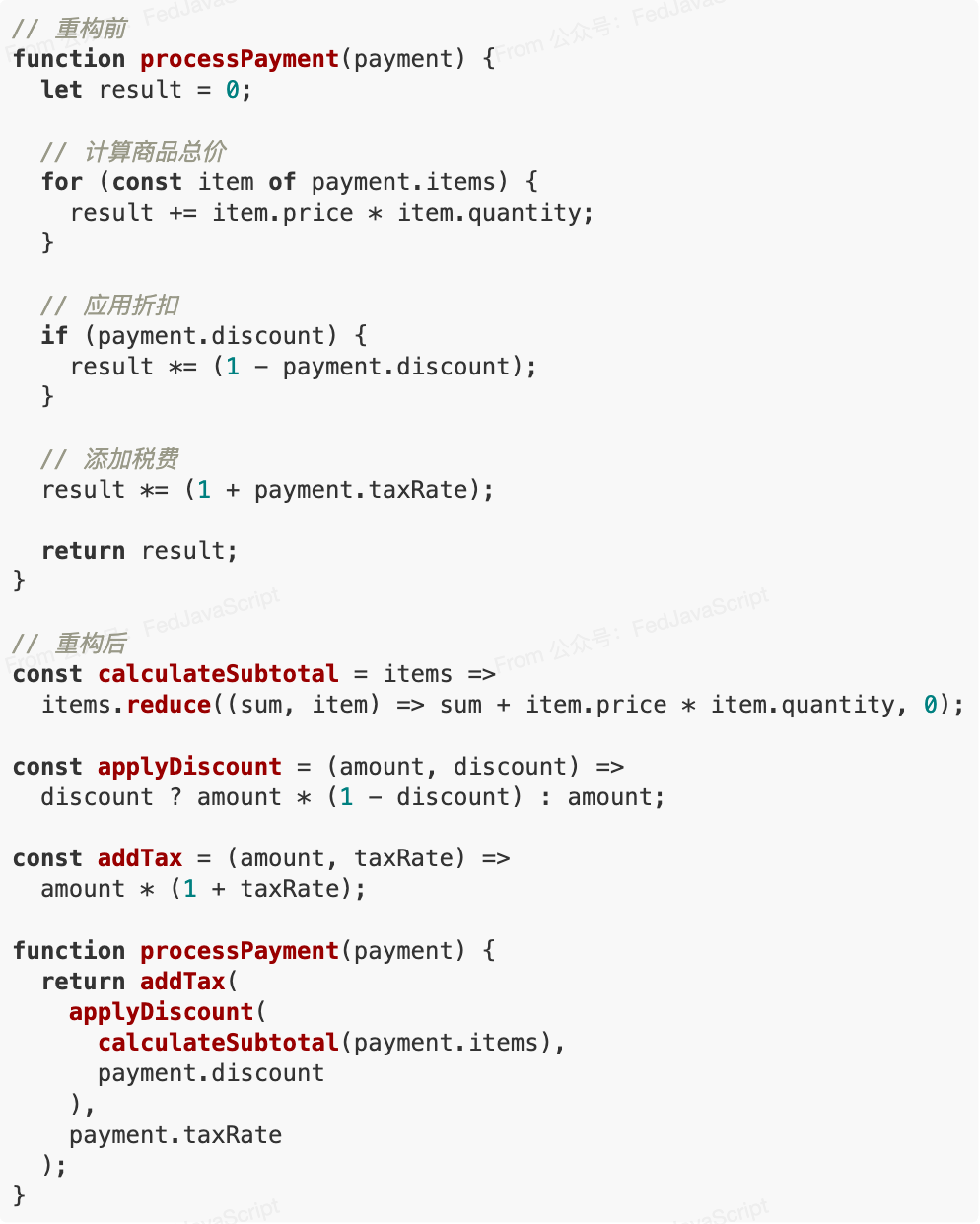 当一个函数变得过于复杂时,可以将其拆分为多个小函数,然后通过组合来实现完整功能。