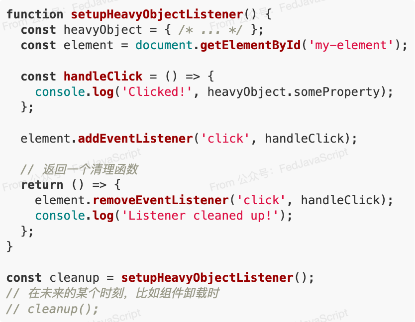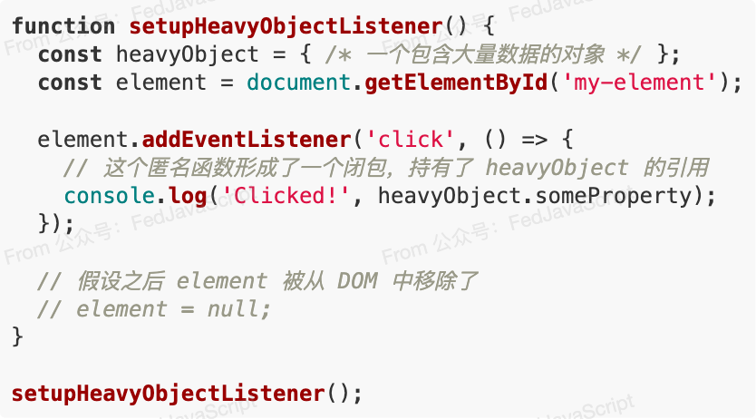 ),这个监听器(闭包)就依然存在,并且它会一直引用着 heavyObject 。这导致 heavyObject element 都无法被垃圾回收器回收。