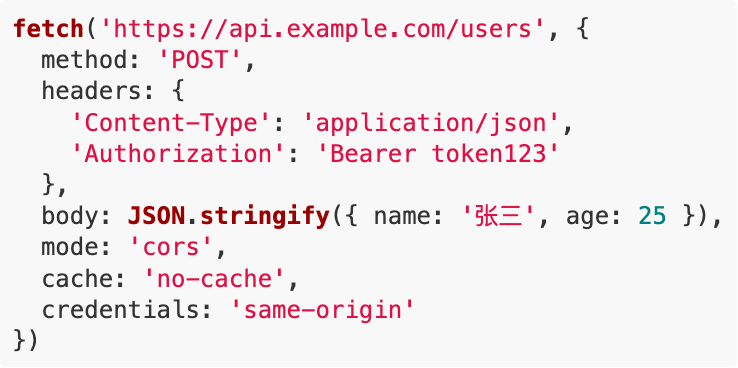 fetch提供了RequestInit对象,允许开发者精确控制请求的各个方面: