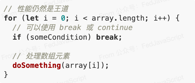 在性能至关重要的场景,传统 for 循环仍然是最快的选择,比 forEach 快约 30%。