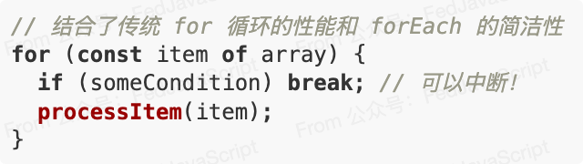 for...of 提供了几乎与 forEach 相同的简洁语法,同时保留了使用 break 、 continue 和 return 的能力。