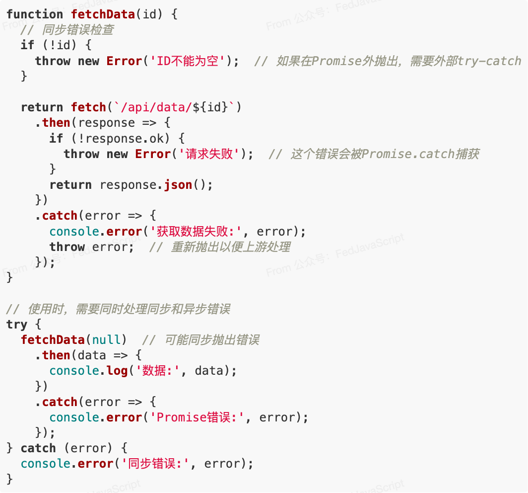 Promise虽然提供了 .catch() 方法,但混合使用同步和异步代码时会变得复杂: