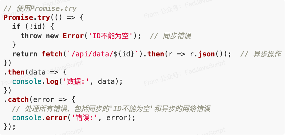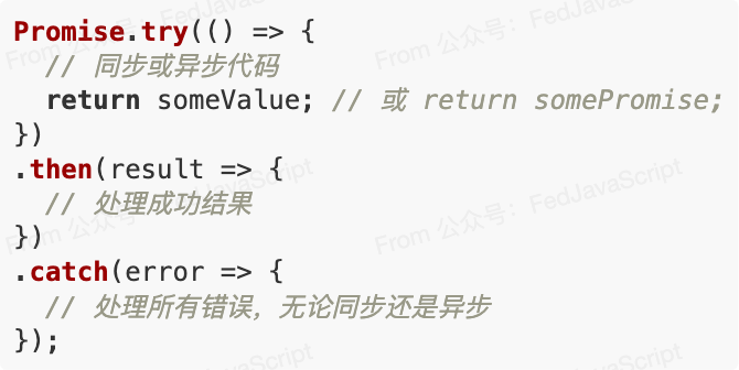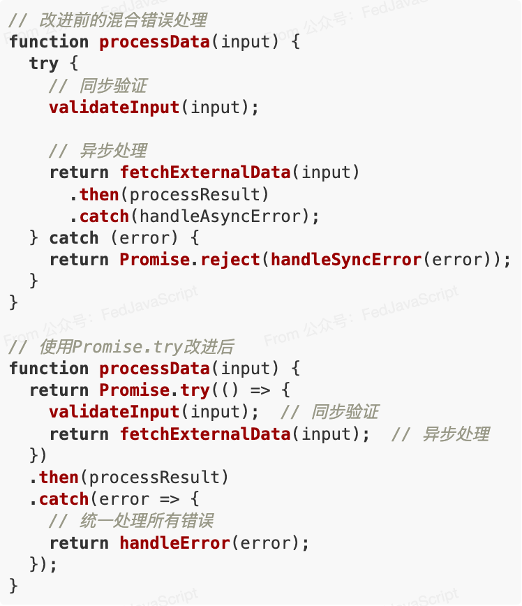 Promise.try使得代码结构更加一致,避免了try-catch块与Promise链的混合使用: