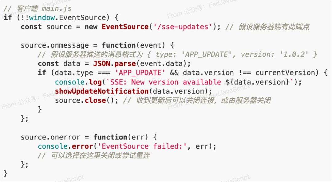 - ** 原理 ** :客户端与服务器建立一个单向的持久连接,服务器可以在任何时候向客户端推送消息。当有新版本部署时,服务器可以主动推送一个“更新”事件给所有连接的客户端。