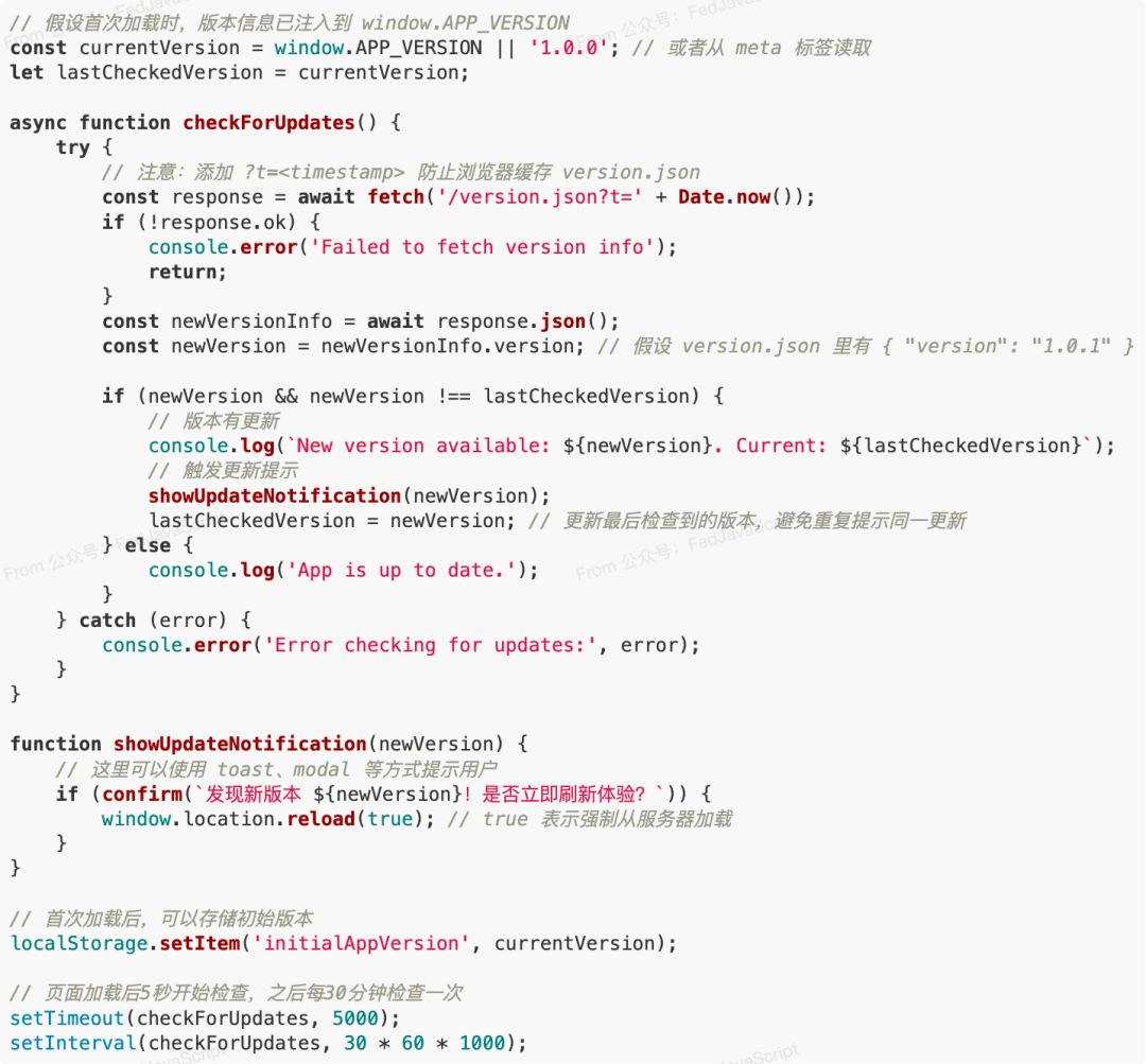 fetch请求这个版本文件。 - 比较获取到的版本信息与当前页面加载时的版本信息(通常可以在首次加载时获取并存储在内存或