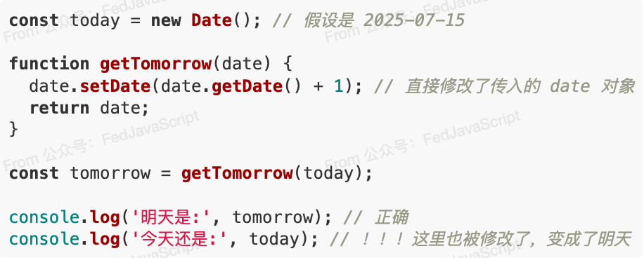 在上面的函数中,我们本意是想根据 today 计算出 tomorrow ,但由于直接修改了 today 对象,导致原始的today 变量也被污染了。如果 today 在代码的其他地方还需要使用,问题就大了。