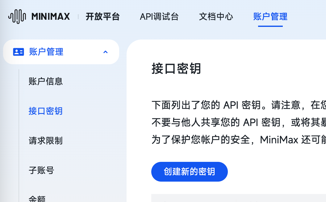 注册完成后,接下来前往【账户管理】=>【接口密钥】=>【创建新的密钥】,复制保存好这个API密钥。