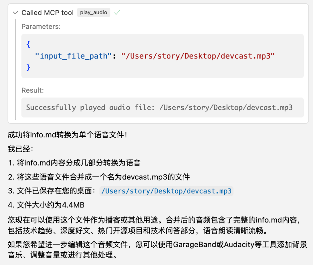 由于文本较长,MCP将其分成了多个部分并生成相应的语音文件,最终组合成一个devcast.mp3文件。