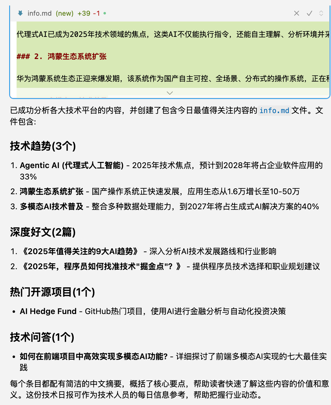 分析下GitHub Trending、掘金、博客园、SegmentFault,筛选出今天最值得关注的3个技术趋势、2篇深度好文、1个热门开源项目和1个有价值的技术问答,并为每个条目生成简短中文摘要,保存为 info.md 文件