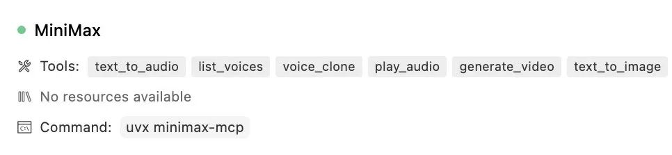 配置完成后,就可以在Cursor中直接使用MiniMax MCP Server了,可以看到,MiniMax为我们提供了多个tool。