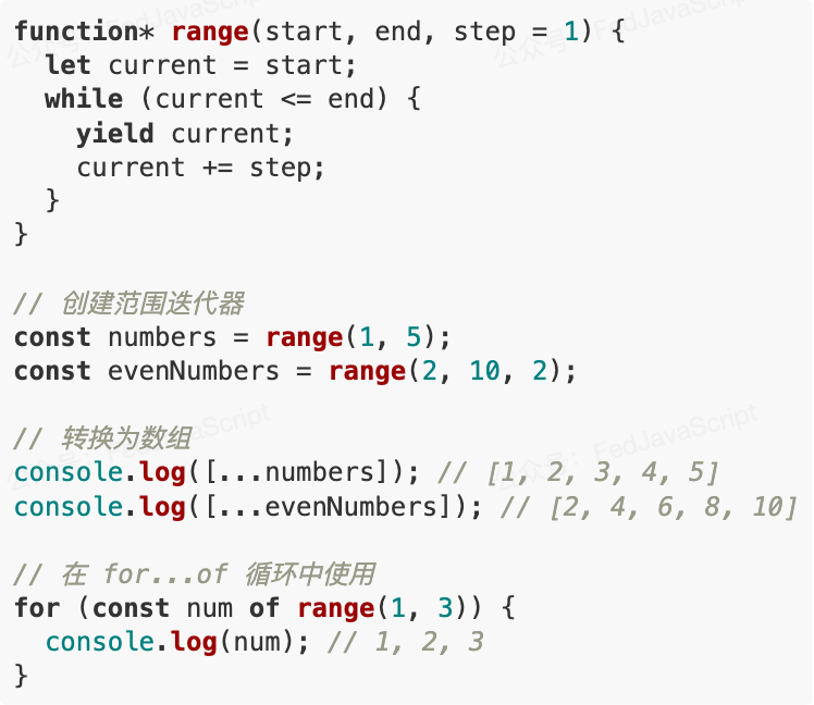 JavaScript 没有原生的范围类型,但我们可以用 Generator 实现: