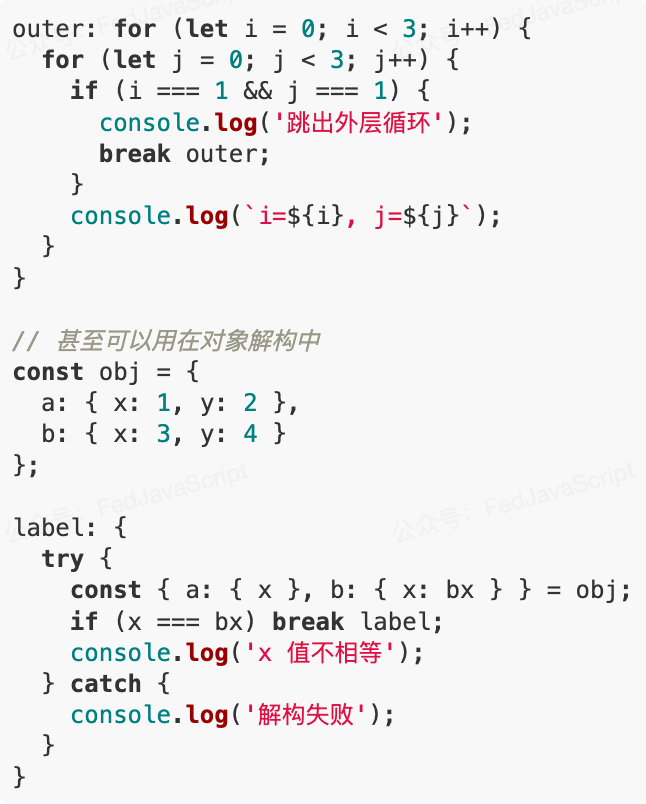 JavaScript 中的 label 语句虽然不常见,但在特定场景下非常有用,特别是在嵌套循环中: