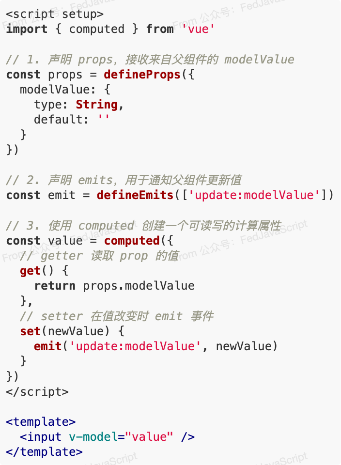 它提供了强大的双向绑定能力,是构建可复用表单组件的基石。但同时,在 <script setup> 风格的组件中实现一个自定义的 v-model ,总免不了那几行“祖传”的样板代码。