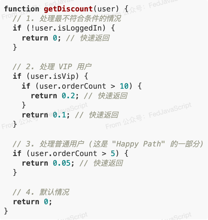 这样,函数的主体部分就可以专注于处理“快乐路径(Happy Path)”,即最核心、最正常的逻辑。