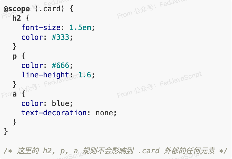 @scope 是一个全新的 CSS @ 规则,它允许我们将样式的作用域 ** 限制在 DOM 树的特定部分 **